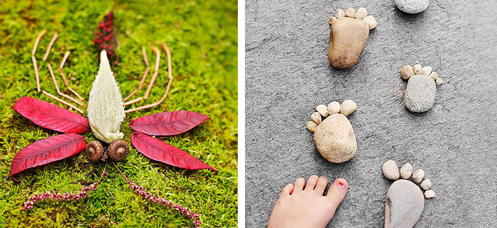 Aranjati forme de picioare facute din pietre (sau alte materiale, cum ar fi crengi sau frunze) ca si cum ar pasi.