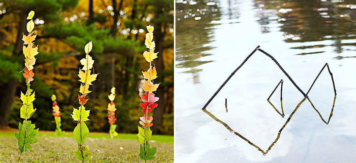 Puteti s faceti si un concurs – cine pune cel mai repede frunzele pe un bat. Pur si simplu infigeti frunze pe bete sau ramuri deja cazute in modele interesante, apoi infigeti batul in pamant.