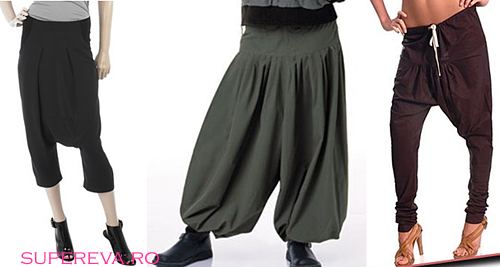 foarte largi in partea superioara, acesti pantaloni amintesc oarecum de cadanele