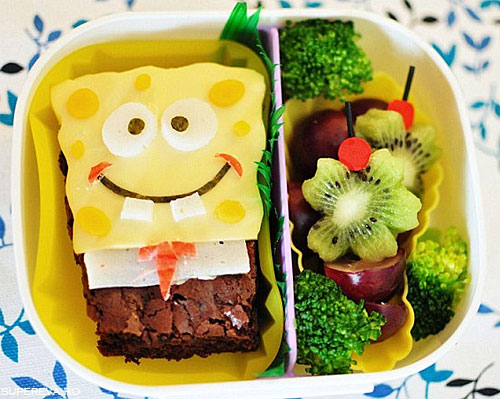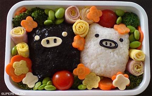 sushi, salate si fructe, toate modelate in personaje de desene animate, cum ar