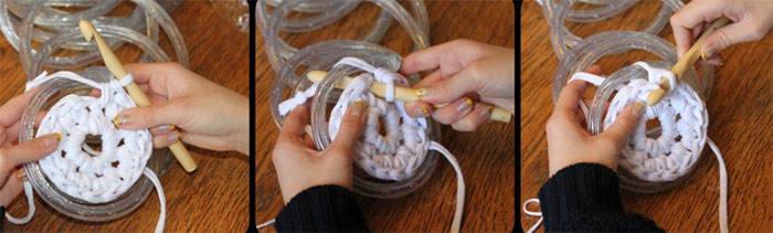 Primul rand este fara luminite, iar in a doilea rand incepeti sa lucrati in jurul lantului de lumina. Veti avea nevoie cu siguranta de un carlig de crosetat gros, dar rezultatul merita 🙂