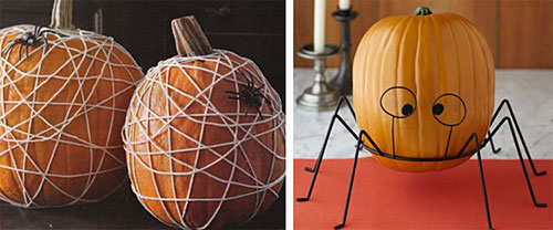 Mult mai incantatori pentru copii sunt dovlecii care ii sperie pe cei ce vor sa ii admire. Paianjenul este un alt personaj simbolic folosit in decoratiunile de Halloween, asa ca puteti crea dovleci infricosatori, folosindu-va de insecte de jucarie plasate pe un decor obtinut din infasurarea unei ate albe in jurul dovleacului. Sau puteti crea un suport ingenios, cu picioare de paianjen in care sa amplasati un dovleac simplu.