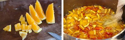 2. Pregateste portocala: taie capetele portocalei, apoi pe lungime in felii. Indeparteaza ( si pastreaza ) semintele, si daca poti, elimina membranele amarui. Acum taie fiecare felie in triunghiuri mici.