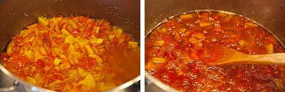 6. Aduc amestecul de macese la fierbere, acopera-le partial si lasa-le sa fiarba timp de 30 minute sau pana cand cojile de portocala pot fi taiate foarte usor. Cand sunt gata, scoate tifonul si pune-l intr-un castron sa se raceasca. Dupa ce se raceste suficient, strange-l usor pentru a extrage cat mai multa pectina. Adauga extrasul din tifon inapoi peste macese.