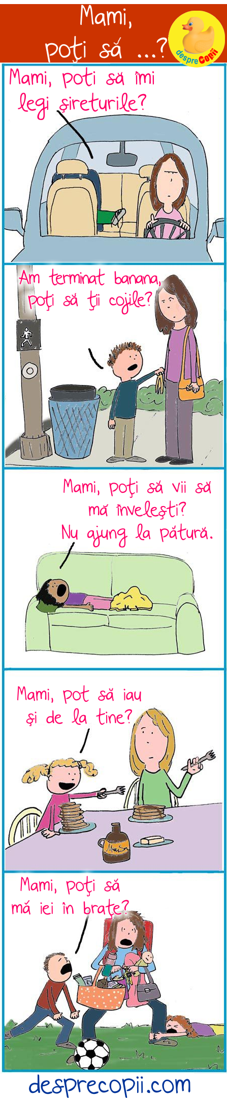 Mami poate orice, chiar si atunci cand nu poate. Cum reuseste? Simplu: e mama si este meseria ei, sau cel putin asta cred copilasii 🙂 Dar oare de ce, in cele mai nepotrivite momente, copiii au nevoie de CEVA, orice nu este posibil in acel moment si nu numai? Asteptam cu drag si intamplarile voastre haioase, cu cerintele “neobisnuite” ale copiilor. Sa vedem cateva exemple: