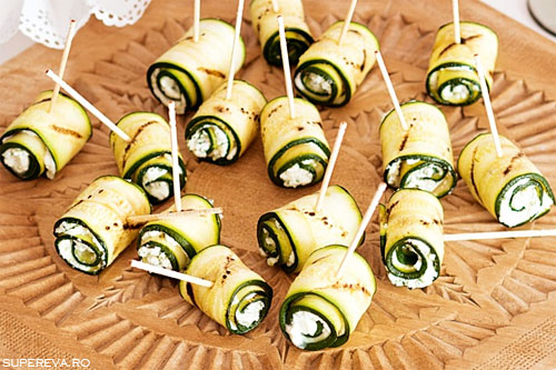 sare si piper. Intinde 1 latura din fiecare felie de dovlecel cu amestecul de