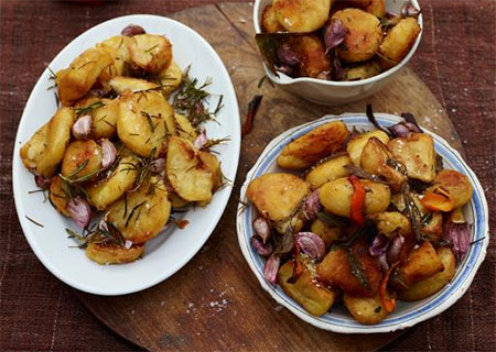 Acum e timpul pentru un truc. Foarte usor turteste fiecare cartof in parte, dar nu ii zdrobi! Adauga ulei de masline si ierburile, usturoiul si un strop de otet de vin rosu, apoi un amestec din cele 3 de mai sus. Se pune din nou totul la cuptor timp de 40 – 45 de minute pana devin crocanti.