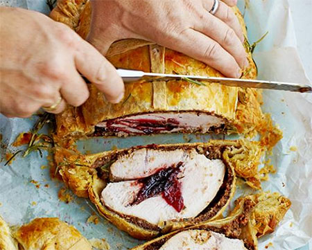 intinde jumatate din umplutura de ciuperci in mijlocul aluatului pentru a acoperi o suprafata de aceeasi dimensiune ca si pieptul de curcan. Scoate scobitorile, apoi aseaza pieptul de curcan si intinde restul de umplutura deasupra acestuia, acoperindu-l. Se aseaza bacon-ul crocant si rozmarinul deasupra, apoi se ung marginile aluatului cu ou batut. Aseaza a doua foaie de aluat peste curcan si amestecul de ciuperci, se modeleaza usor cu mainile impingand tot aerul afara si sigiland aluatul. Taie marginile la aproximativ 4 cm.