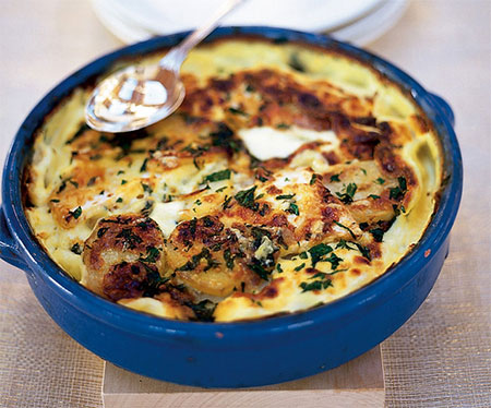 Se incalzeste cuptorul la 200°C. Pune cartofii, telina si ceapa intr-un vas termorezistent. Asezoneaza dupa gust. Adauga usturoiul, ¾ din branza, smantana si patrunjelul. Cu o lingura amesteca totul usor. Se presara branza suplimentar, si se coace in cuptorul preincalzit timp de 50 de minute, sau pana cand se prinde o frumoasa culoare aurie. Se presara peste frunze de patrunjel si se serveste.