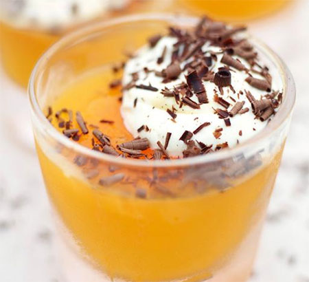 Toarna sucul de clementine intr-o tigaie la foc mare pentru a se incalzi, nu se fierbe. Adauga putin zahar dar nu prea mult. Raznuieste putin ghimbir intr-o farfurie si adauga sucul acestuia in tigaie. Se opreste focul. Adauga gelatina peste suc (dupa instructiunile de pe pachet), apoi amesteca bine. Aranjeaza sase pahare mici pentru servire si adauga cate doua felii de clementine in fiecare. Imparte amestecul de suc cu gelatina in fiecare pahar, apoi pune-le la racit in frigider pentru cel putin trei ore. Pentru servire amesteca vanilia in iaurt si adauga cate o lingura din acest amestec peste jeleu, apoi rade putina ciocolata peste iaurt.
