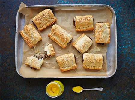 Perie laptele de migdale (sau lapte de vaca) de-a lungul marginilor de aluat, sa se lipeasca. Apasa marginile pentru a le sigila, apoi prin presare cu o furculita. Repeta procedeul si cu restul ingredientelor, apoi se taie fiecare lungime in patru bucati egale.