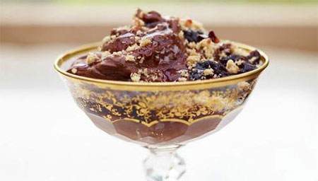 Chiar inainte de servire, se presara putina cacao, se pun ciresele amare (ciresele uscate amare se pun intr-o tigaie cu un pahar de amaretto si apa, se fierb un pic apoi se lasa acolo pana "revin la viata"). Optional se rup snaps-urile de susan in bucatele (sunt acele pachetele cu fasii de susan dulce) si se presar peste cacao.