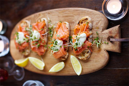Adauga ½ lingurita de hrean peste crema si amesteca bine. Se presara sare, piper negru proaspat macinat si se stoarce sucul de lamaie (dupa preferinta), apoi se amesteca din nou. Taie o paine ciabatta in felii groase de 1 cm, prajeste-o sau rumeneste-o pe grill si burniteaza un pic de ulei de masline extra virgin. Aseaza apoi feliile de somon afumat, adauga amestecul de hrean, apoi decoreaza cu putin creson. Se termina cu cateva picaturi de ulei de masline extra virgin si un pic de suc de lamaie.