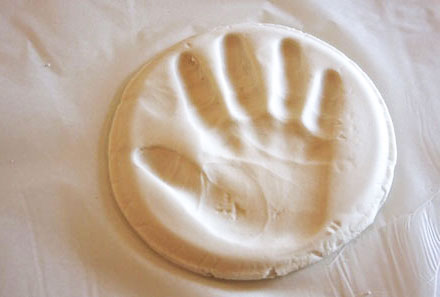 In primul rand, aveti nevoie de o mana de “lut”, care este de aproximativ 1 centimetru la 1,5 centimetri grosime si suficient pentru a se potrivi mana copilului. Puteti face acest lucru cu ajutorul unui sucitor si un taietor de prajituri rotund, dar mie imi place marginile naturale atunci cand materialul este aplatizat cu un obiect plat, cum ar fi o farfurie.