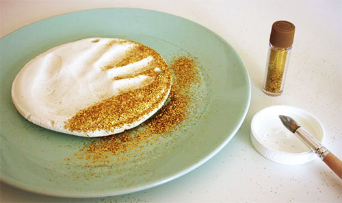 E timpul pentru finisare: decorarea! periati cu lipici alb marginile exterioare (nu si pe amprenta) apoi presarati sclipici, scuturand atent excesul. Continuati procesul pana cand rezulta ceea e va doriti.