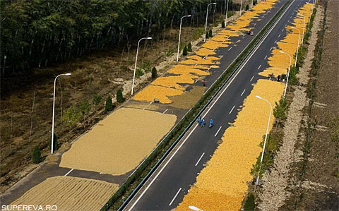 Chinezii usuca pe drum porumb