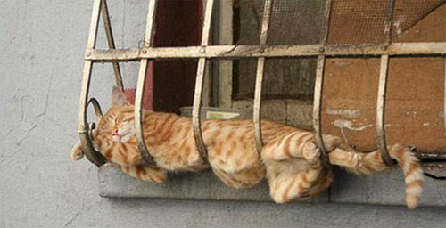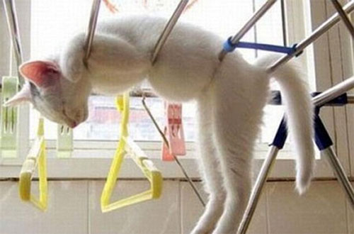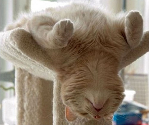 O pisicuta crem atarna cu capul in jos…nu, nu se intinde dupa un soricel, ea chiar a adormit asa