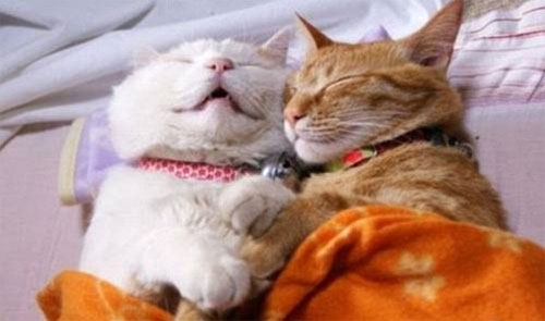 O pereche de pisici sunt prinse intr-un moment tandru sub o patura portocalie…insa nici cei de mai jos nu se lasa!
