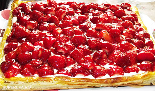 Dupa ce toate sunt pregatite si racite, se intinde amestecul de mascarpone peste foietajul copt, se aranjeaza capsunile (dupa prefetinta), iar la final se unge cu siropul rece.