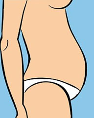 burta este acompaniat adesea de grasime depusa pe solduri si pe picioare.